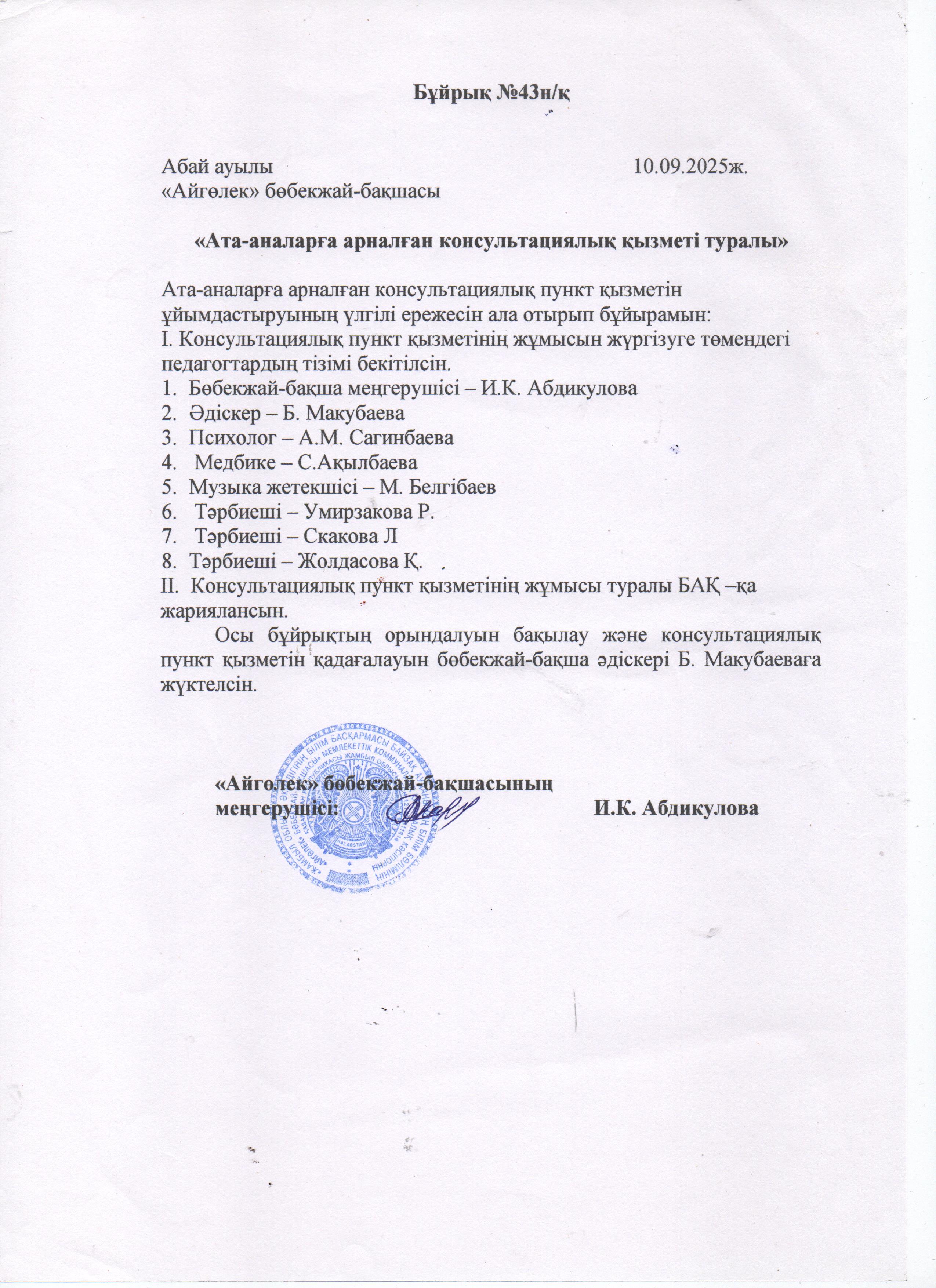 Ата -аналарға арналған консультациялық пункт қызметін ұйымдастыру туралы