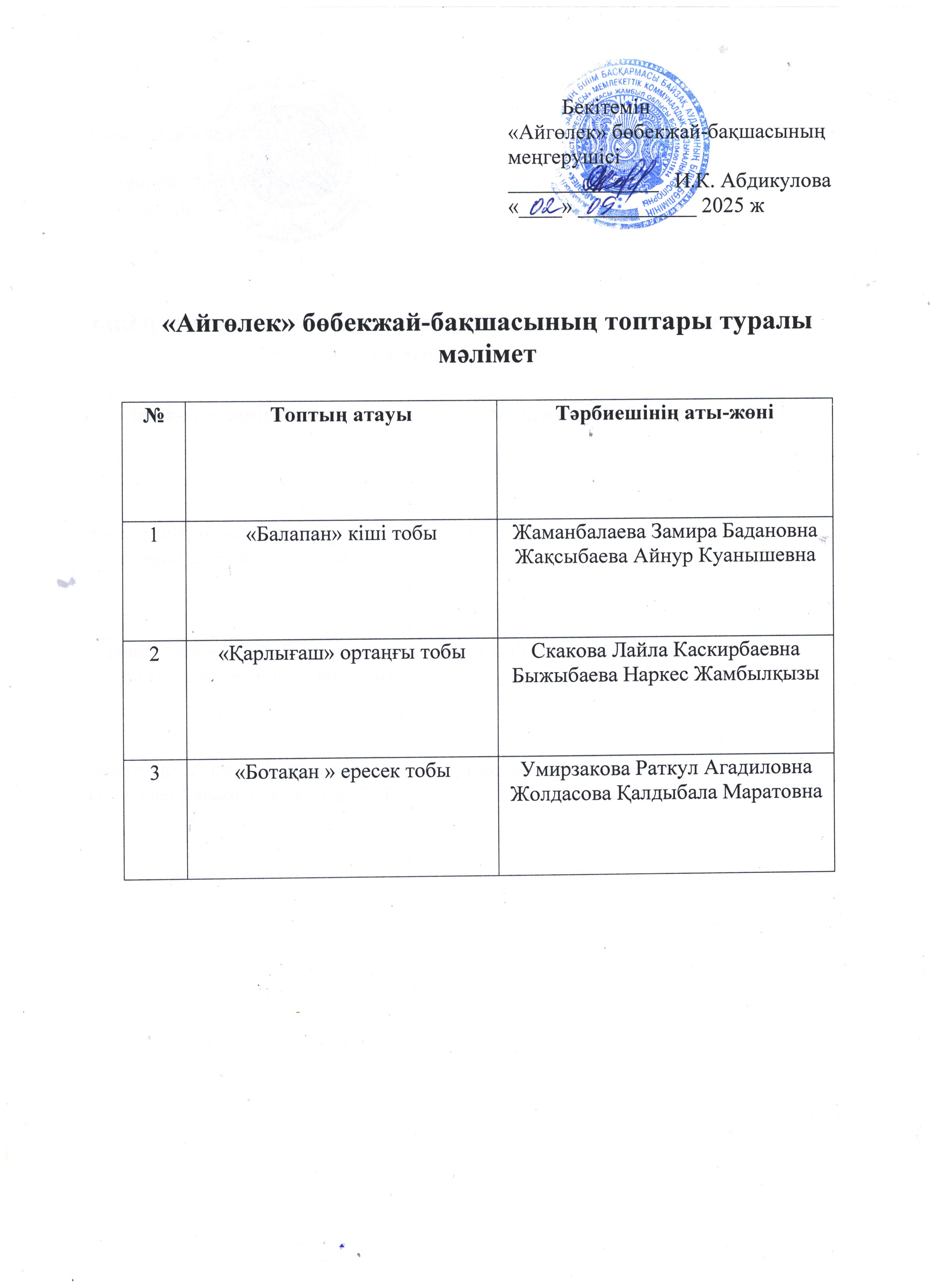 » "Айгөлек" бөбекжай-бақшасының топтары туралы мәлімет